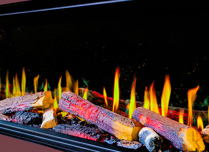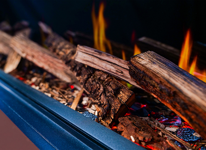 De haard wordt standaard geleverd met gloeiende berkenstammen en vier extra blokken in eikenhout-look, die je naar eigen voorkeur kunt indelen. Voor een nog natuurlijker effect is er optioneel een echte eikenhouten stammensetverkrijgbaar (zonder gloeieffect).