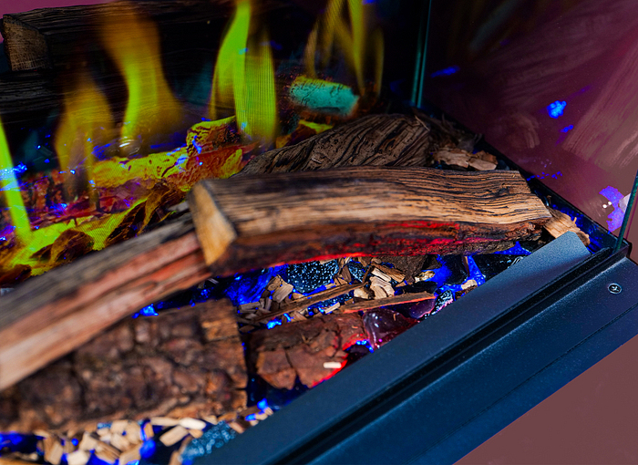 16 vlameffecten, 9 kleuren in de houtstammen en 10 kleuren in het vuurbed